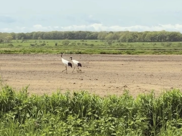 今年の春に孵ったヒナの姿もみられました!ヒナはふわふわの茶色い羽毛に包まれ親鳥に寄り添いながら湿原や草地を歩き回ります。