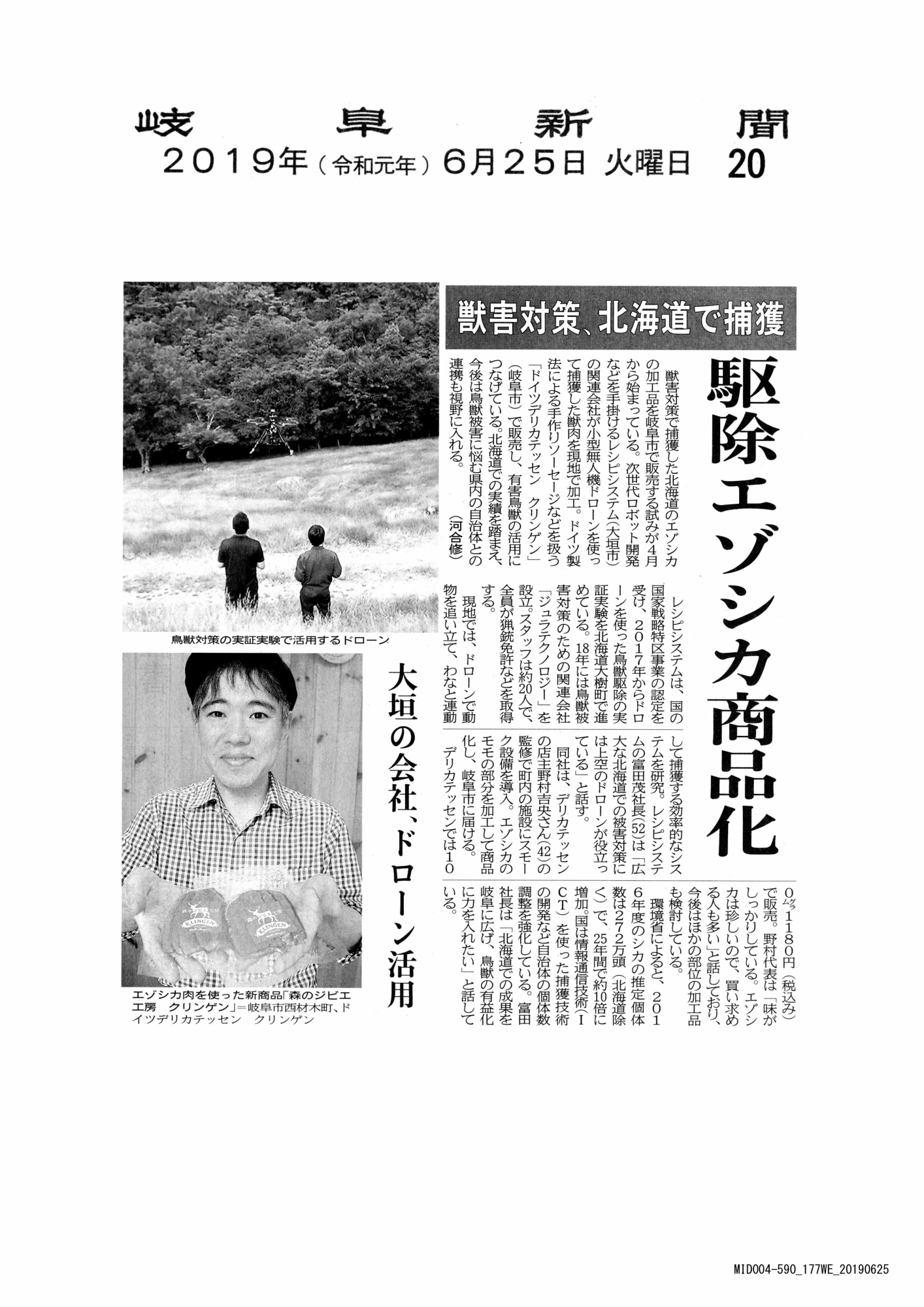 2019年6月25日(火)獣害対策で捕獲したエゾシカを食肉加工し岐阜市で販売開始した記事が岐阜新聞に掲載されました。2018年に設立したジュラテクノロジー株式会社が北海道での有害鳥獣の有益化事業の成果を岐阜でも発揮していくことが期待されています。