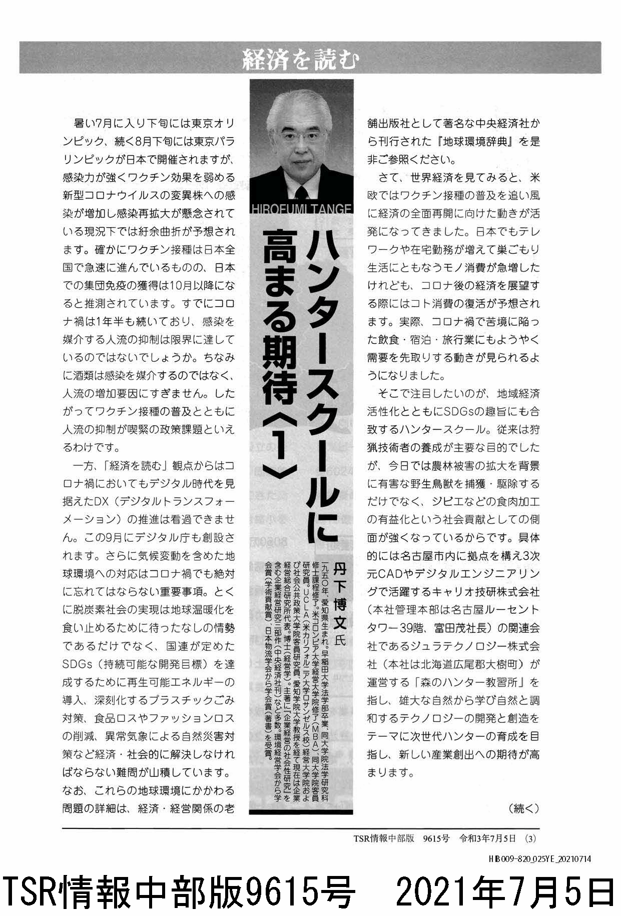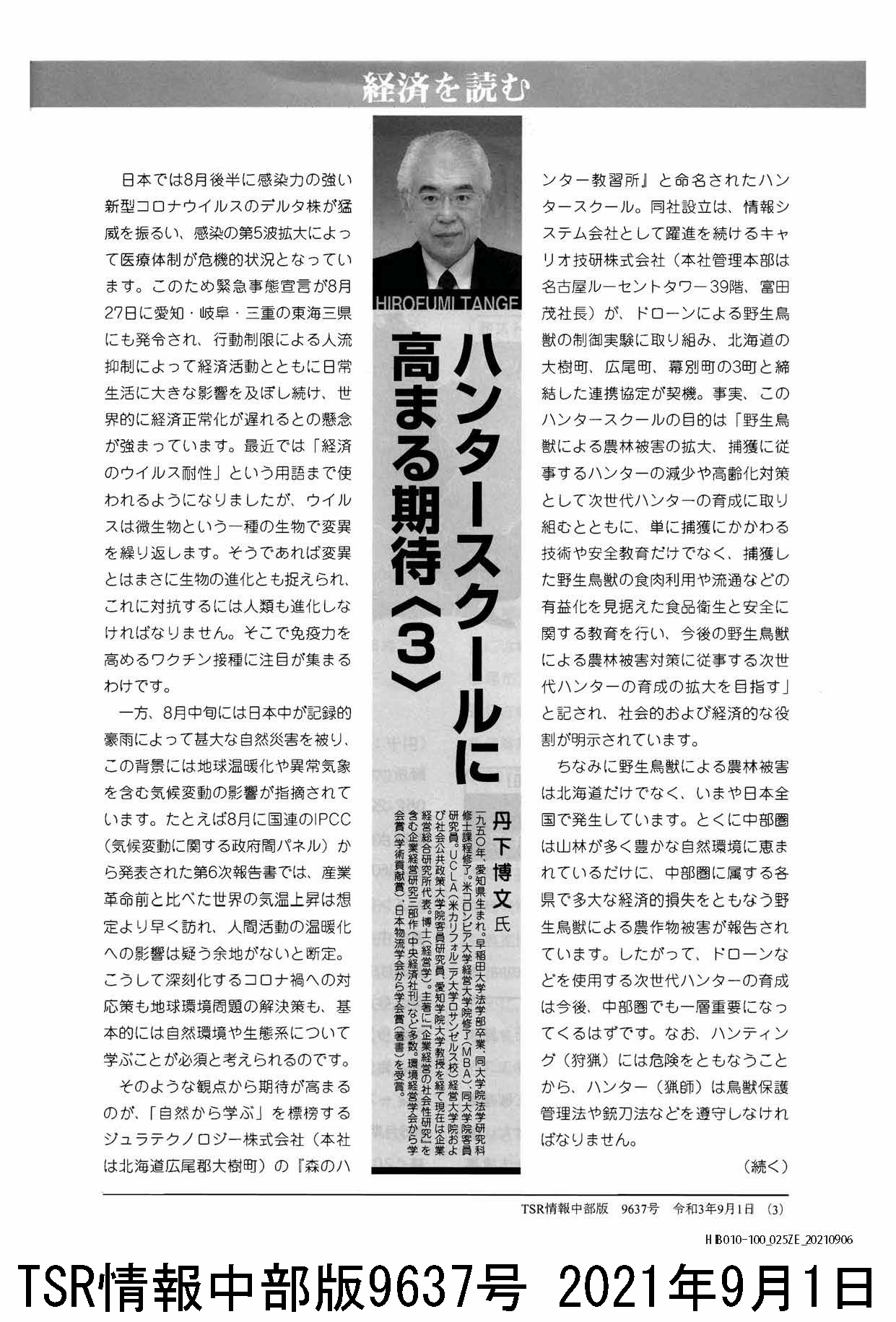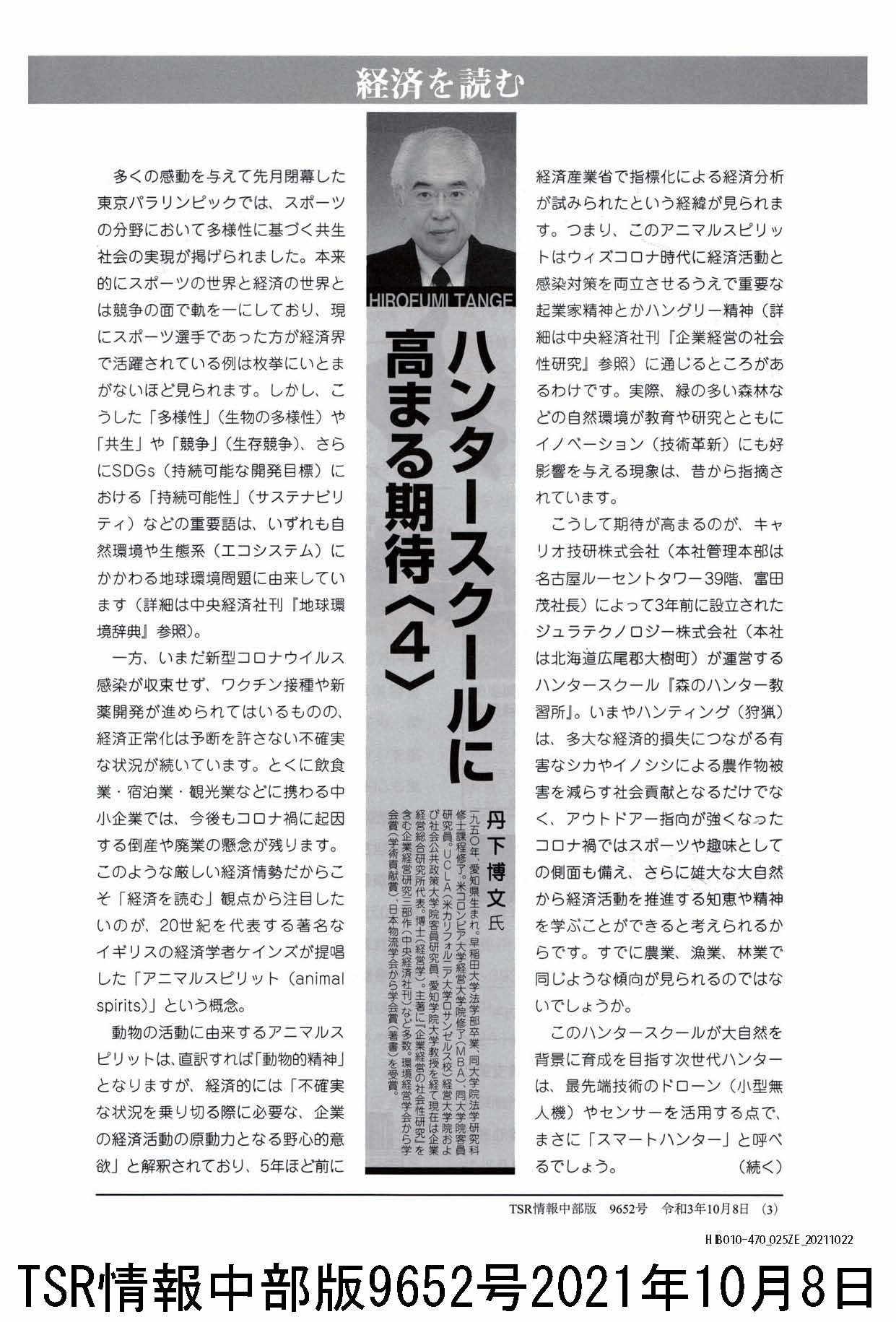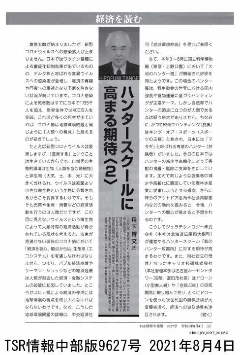 TSR情報中部版9615号、9627号、9637号、9652号、9663号にて企業経営総合研究所代表丹下博文氏に 「ハンタースクール『森のハンター教習所』に期待が高まる」と述べられた上で、弊社をご紹介頂きました。