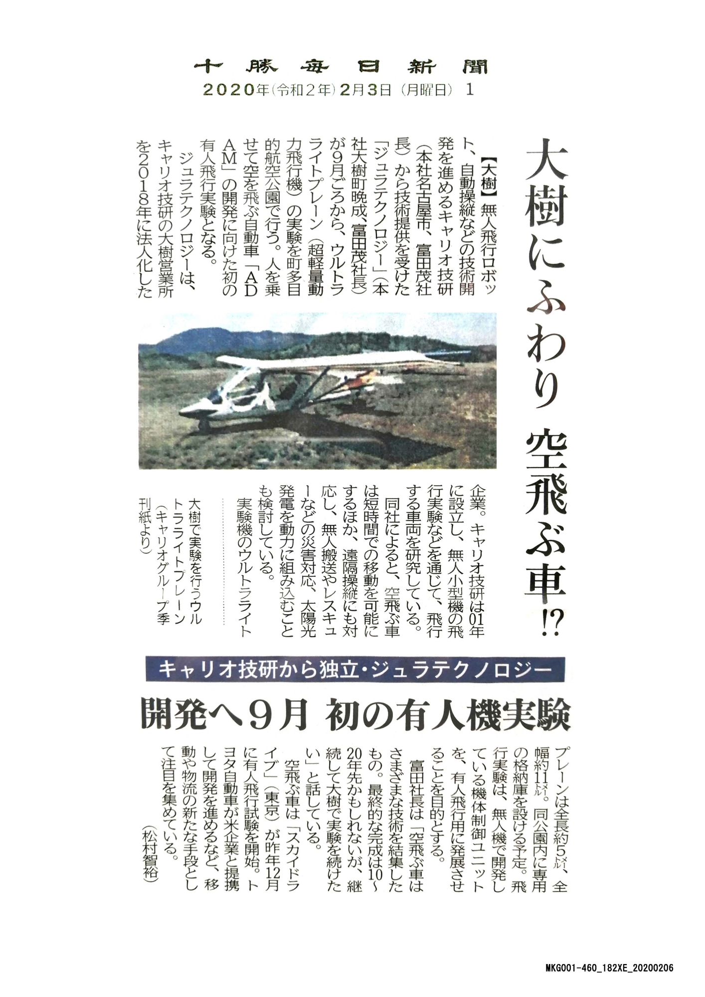 2020年2月3日(月)ウルトラライトプレーン(超軽量動力機)の実験を行う記事が十勝毎日新聞に掲載されました。人を乗せて空を飛ぶ自動車の開発に向けた初の有人飛行実験を北海道大樹町で行うことが記事に取り上げられました。