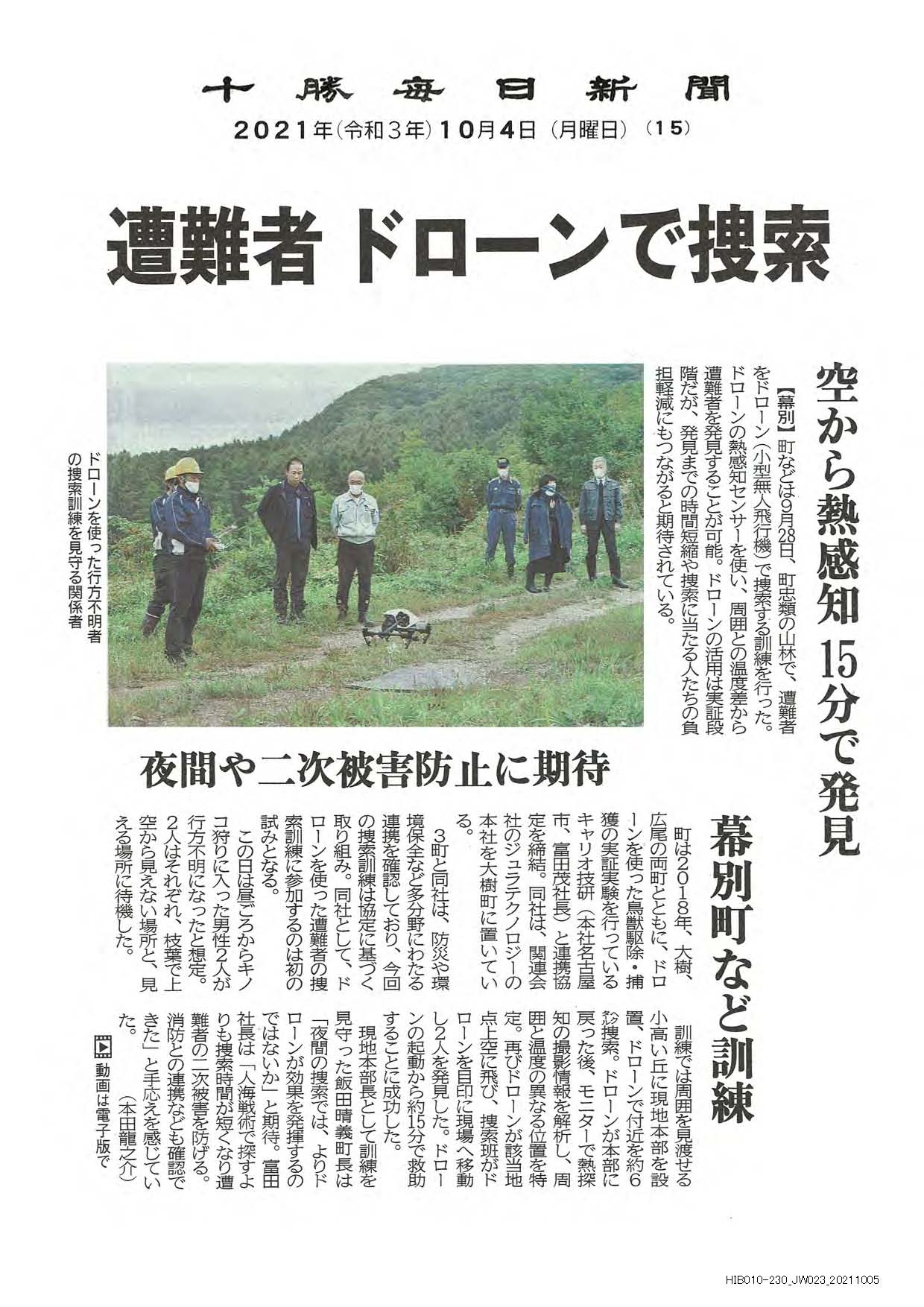 2021年10月4日(月)ドローンを活用した遭難者捜索訓練についての記事が十勝毎日新聞に掲載されました。