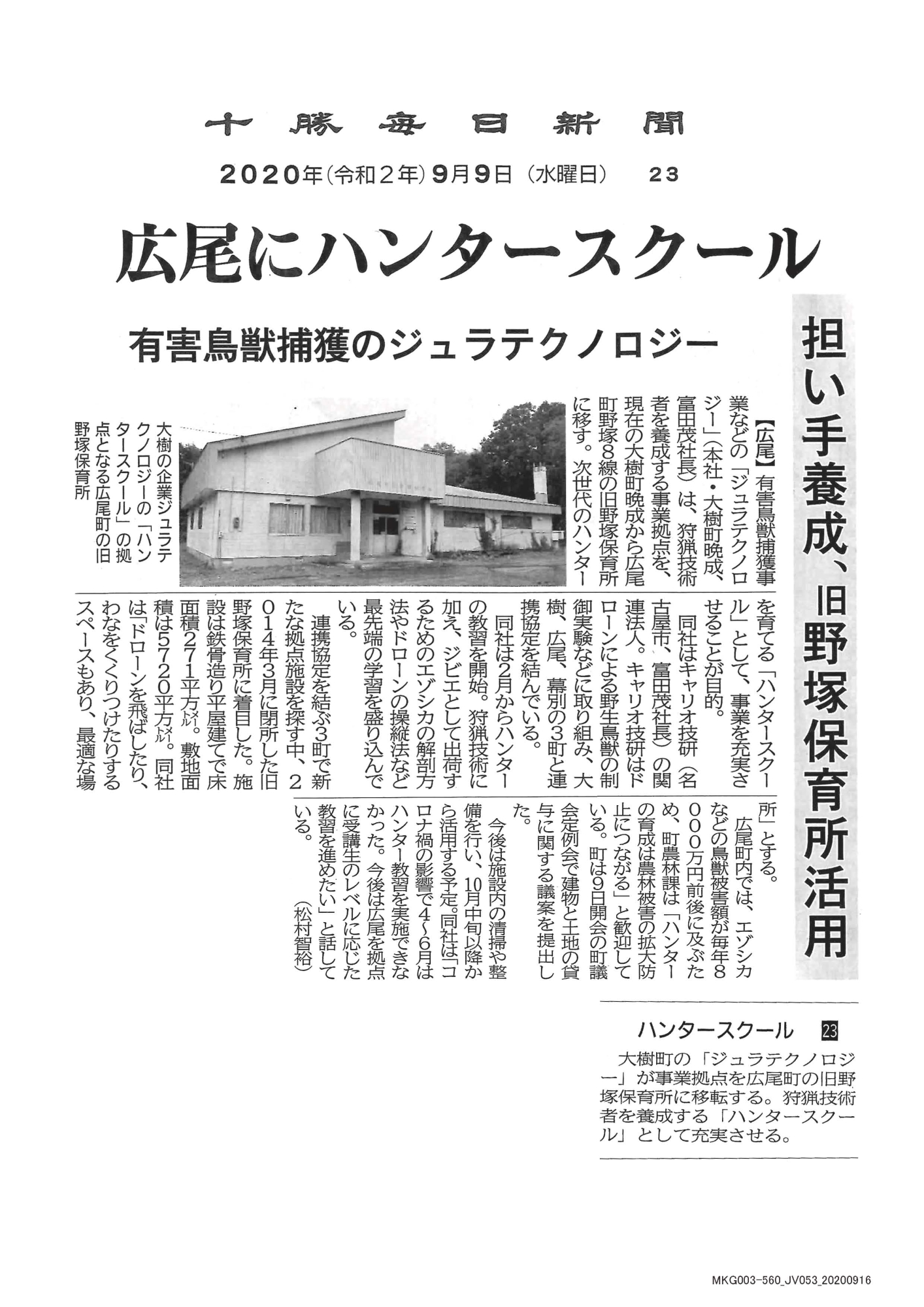 2020年9月9日(水)弊社次世代ハンターの育成プログラム事業「森のハン ター教習所」に関する記事が十勝毎日新聞に掲載されました。