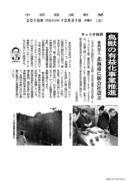 2018年12月31日(月)新会社「ジュラテクノロジー株式会社」設立の記事が中部経済新聞に掲載されました。今後、野生鳥獣対策をすすめるとともに、捕獲した野生鳥獣を有益化する事業を行う会社として紹介されました。