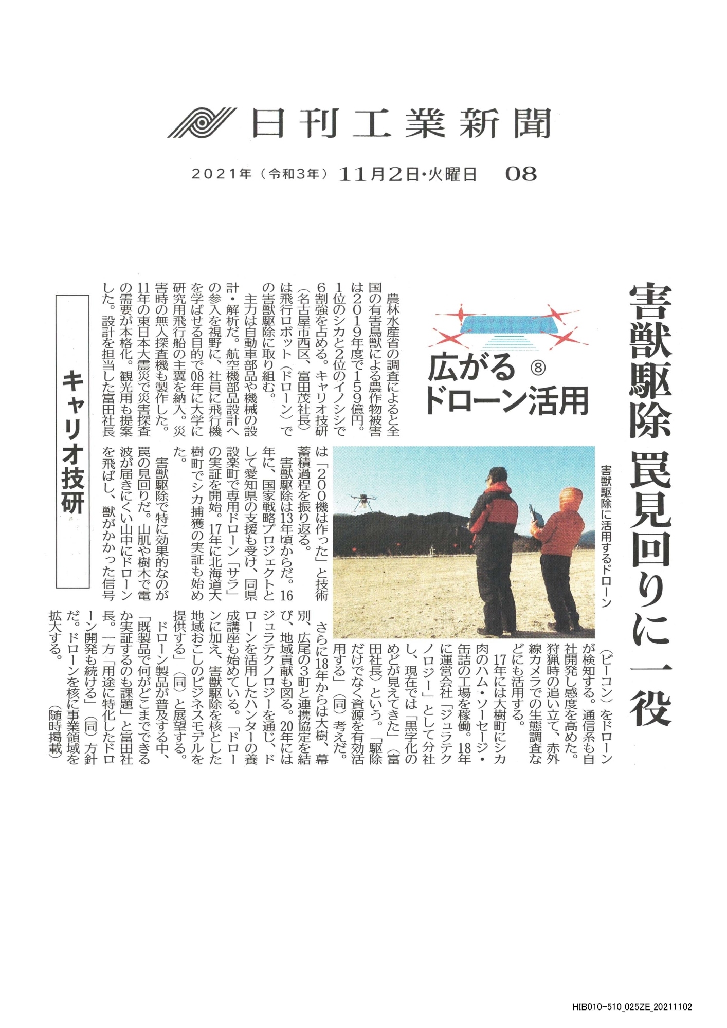 2021年11月2日(火)ドローンを活用した害獣駆除についての記事が日刊工業新聞に掲載されました。