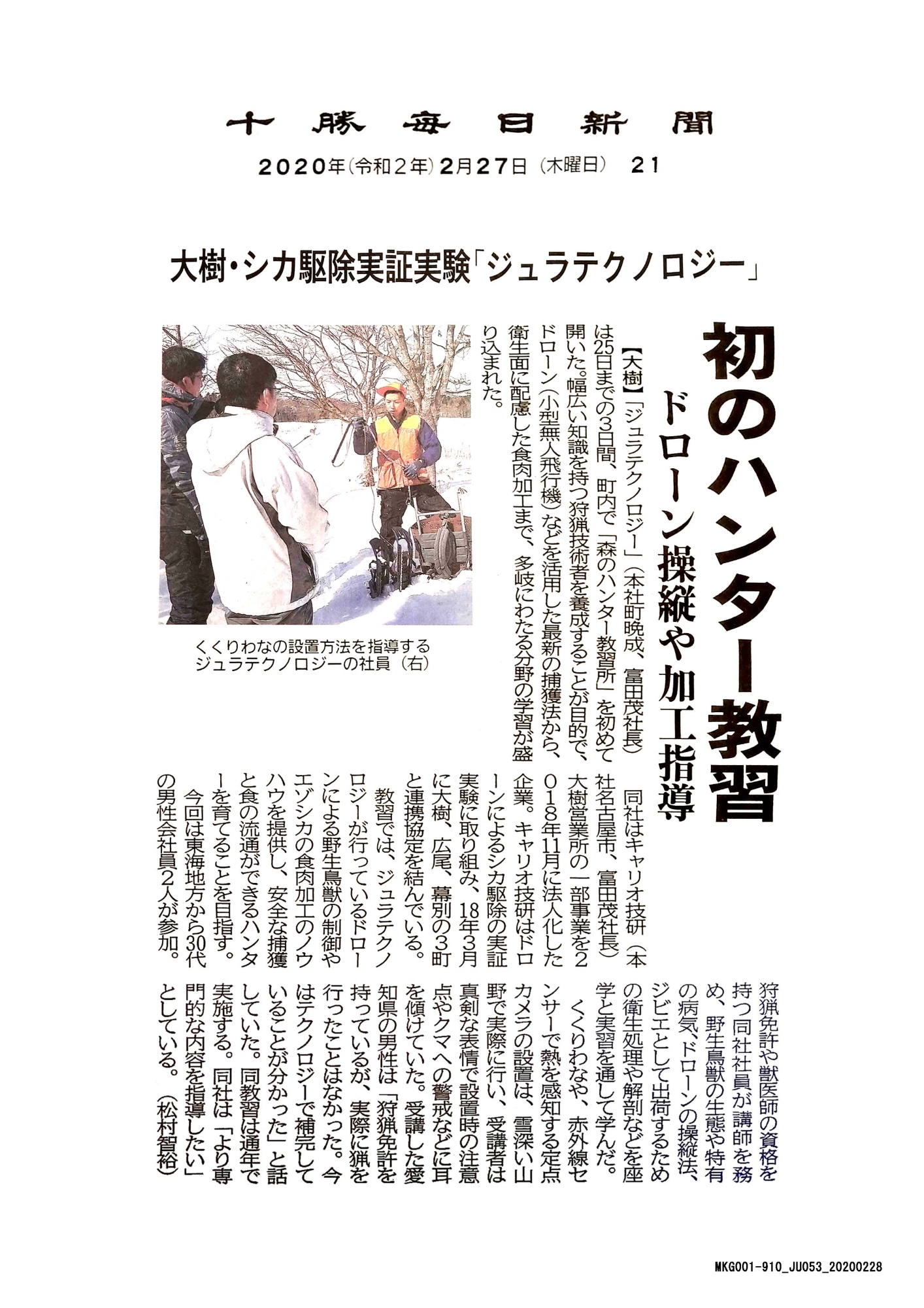 2020年2月27日(木)ジュラテクノロジー初のハンター教習の記事が十勝毎日新聞に掲載されました。最新の捕獲法から、食肉加工まで幅広い知識を持つ狩猟技術者を養成する「森のハンター教習所」を開きました。