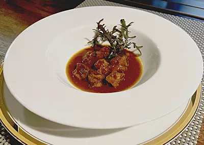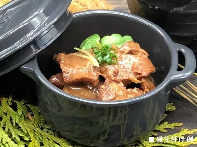 えぞ鹿肉の骨や筋から旨味を引き出したデミグラスソースで鹿肉を煮込みました。