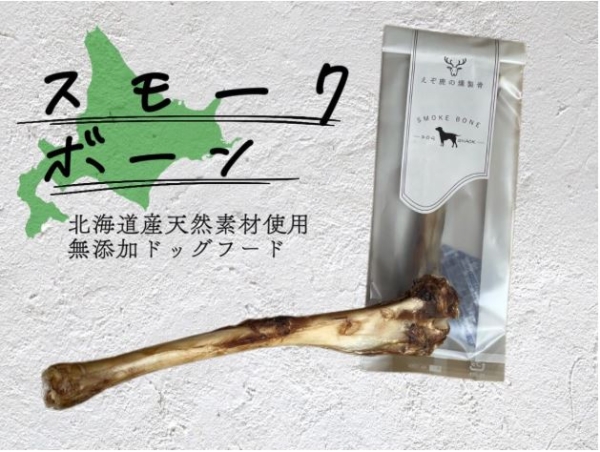 えぞ鹿の脚骨を大胆に使用した犬用おやつ「スモーク ボーン」野生のうまみと香りが愛犬の本能をくすぐります・・・!デンタルケアにも最適です。